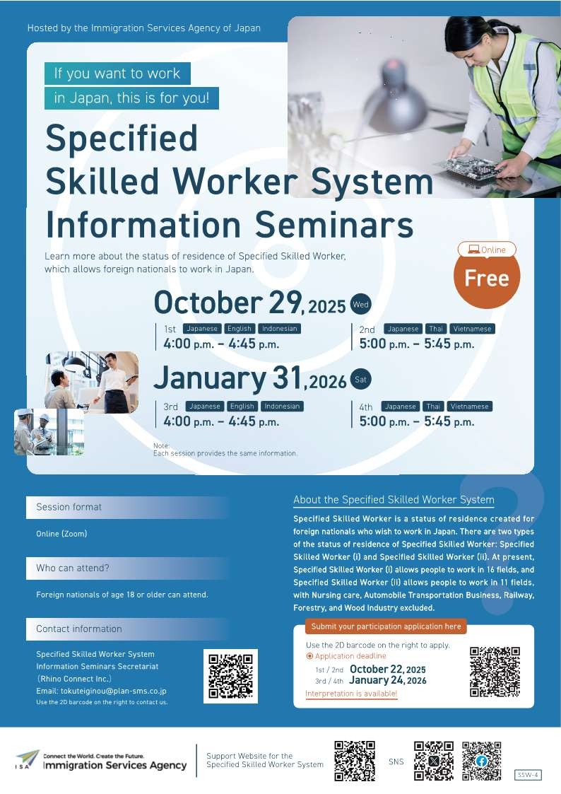 Nhằm hỗ trợ người lao động nước ngoài có nguyện vọng làm việc ở Nhật Bản theo chế độ “kỹ năng đặc định”, Tổng cục quản lý xuất nhập cảnh và lưu trú, Bộ Tư pháp Nhật Bản sẽ tổ chức “Hội thảo giới thiệu chế độ kỹ năng đặc định” theo hình thức trực tuyến.