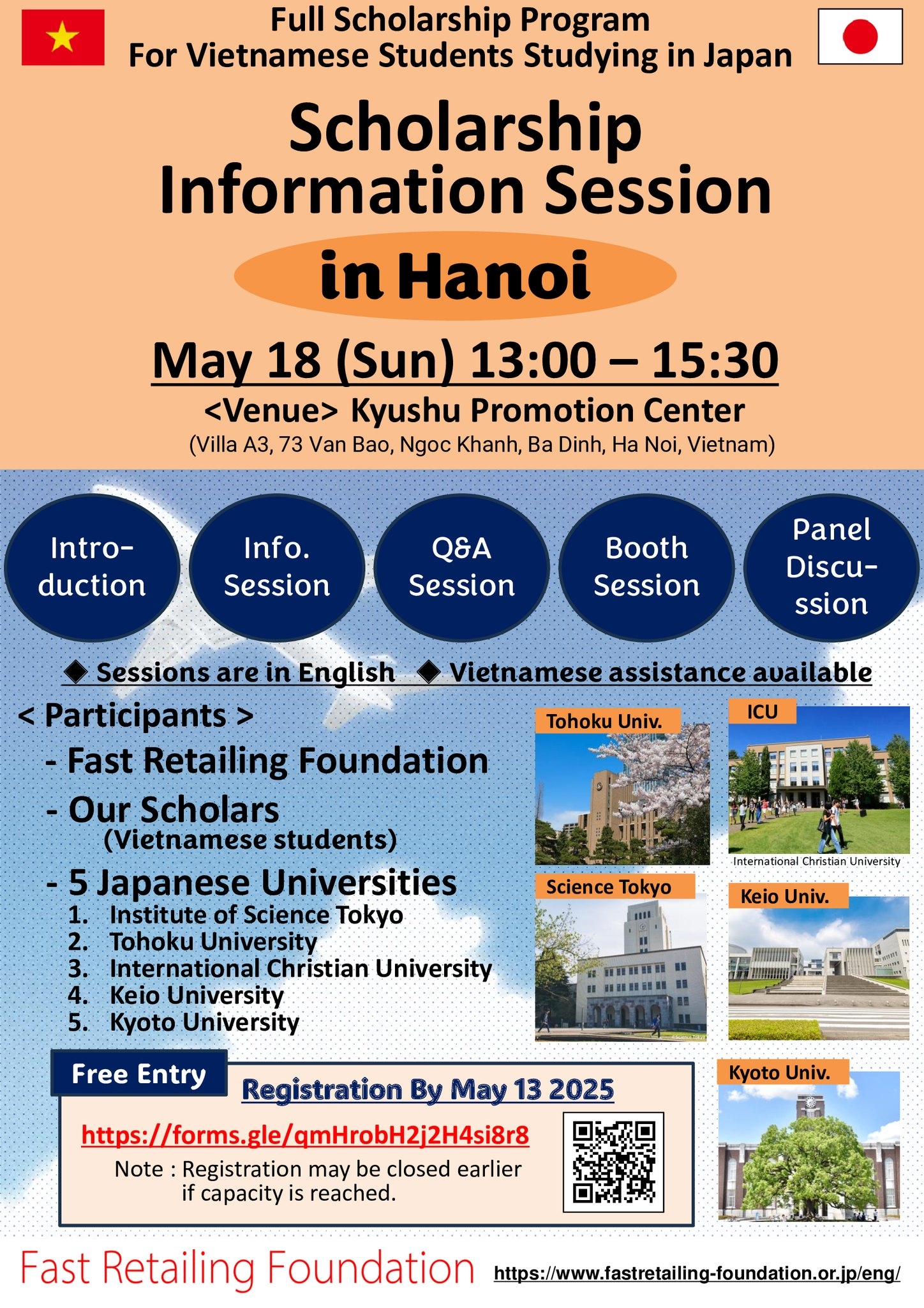 奨学金の対象となる5大学(京都大学、東北大学、東京理科大学、慶應義塾大学、国際基督教大学)の担当者や奨学生3期生も参加して皆さんの質問に直接お答えします。
