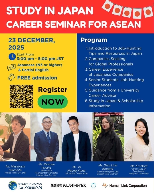 日本留学を検討している方はもちろん、将来のキャリアについて考えている方にも、本セミナーは留学から就職までの流れをわかりやすく知っていただけるとても貴重な機会です。皆さんのご参加をお待ちしております~